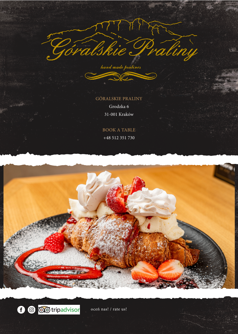 Góralskie Praliny to kawiarnia, ciastkarnia i bar koktajlowy w sercu Krakowa – przy ul. Grodzkiej 6. Codziennie serwujemy świeże cornetto (croissant), gofry, focaccię, desery lodowe i lody własnej produkcji na bazie naturalnych składników. W naszej ofercie znajdziesz także autorskie praliny, ciasta oraz aromatyczną kawę. Wnętrze łączy góralski klimat z nowoczesnym stylem – to idealne miejsce na śniadanie, lunch, deser lub randkę. Szukasz lodziarni, kawiarni lub ciastkarni w centrum Krakowa? Zapraszamy do Góralskich Pralin – miejsca, gdzie jakość, smak i lokalność tworzą niezapomniane doświadczenie.